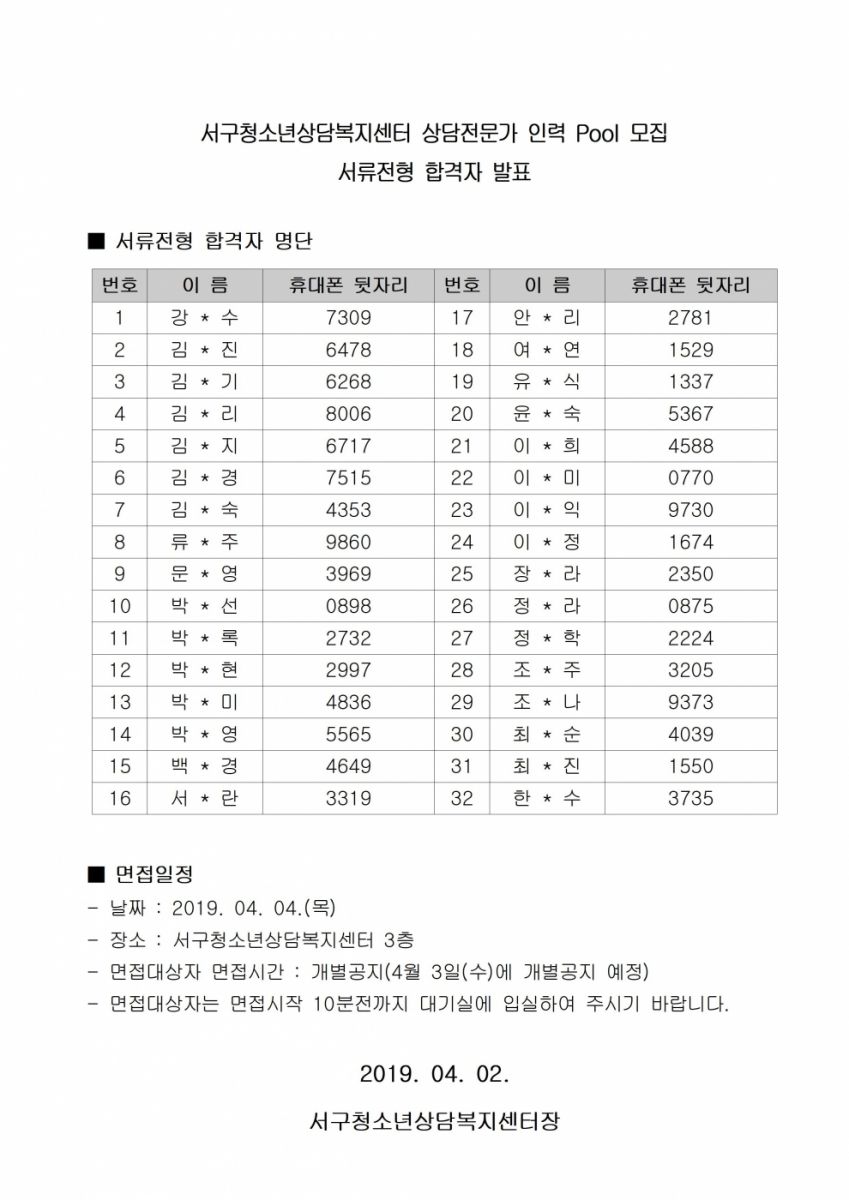 [발표]대구시 서구청소년상담복지센터 상담전문가 인력Pool 모집 서류전형 합격자 발표