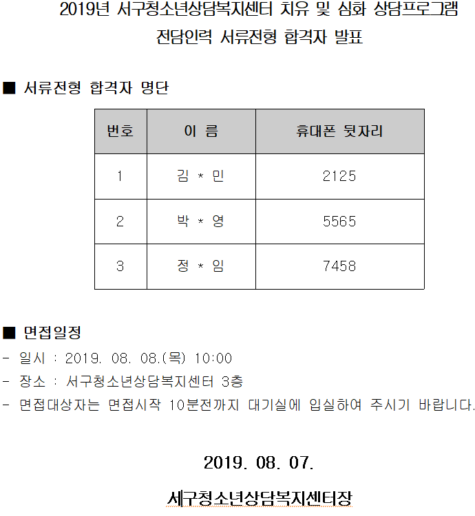 [발표] 대구시 서구청소년상담복지센터 치유 및 심화 상담프로그램 전담인력 서류전형 합격자 발표